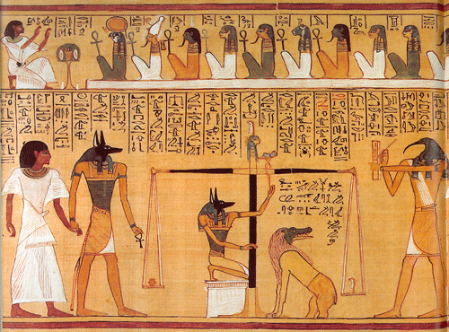 그 뒤 아누비스가 맡은 일은 오시리스가 있는 저승에서 그를 보좌해 사망자를 인도하는 책임을 지며, 죽은 자의 영혼을 심판하는 것이다. 자신이 가지고 있는 진실의 날개와 죽은 자의 심장의 무게(이집트인들은 인간의 혼이 심장에 머무른다고 여겼다)를 천칭으로 비교하여 죽은 자의 혼이 깨끗한지 더러운지의 여부를 판가름 한다. 이 때 더러운 혼으로 가득한 심장은 아래로 떨어져 거대한 괴수인 암무트에게 먹힌다. 그 모습은 사자의 서나 무덤의 벽면 등에 그려져 있다. 사신의 이미지를 가지고 있지만 악신은 아니다.
